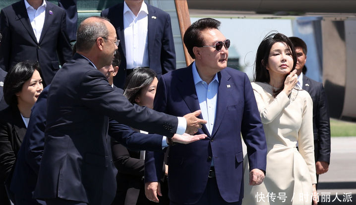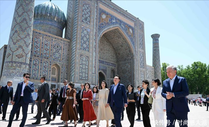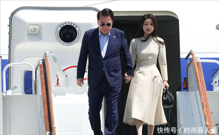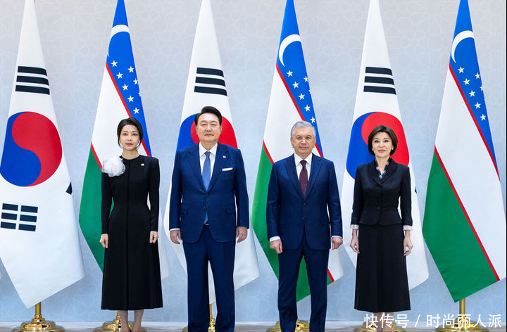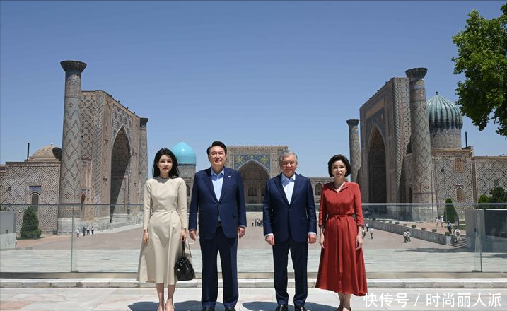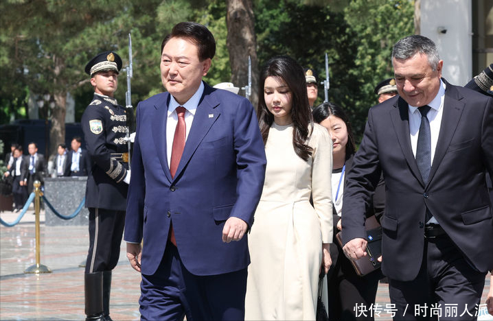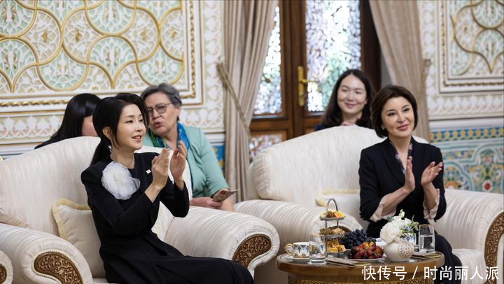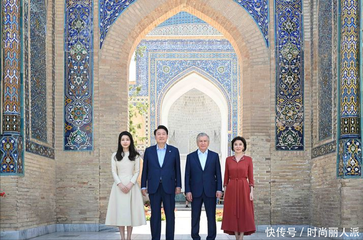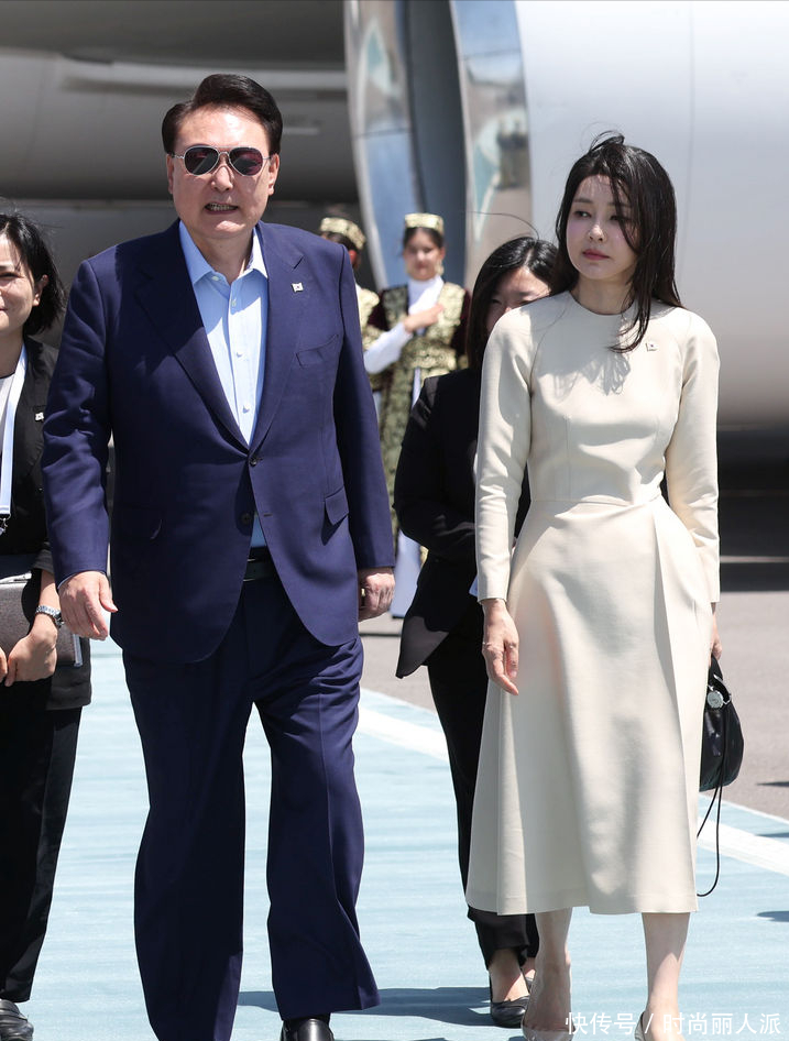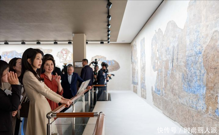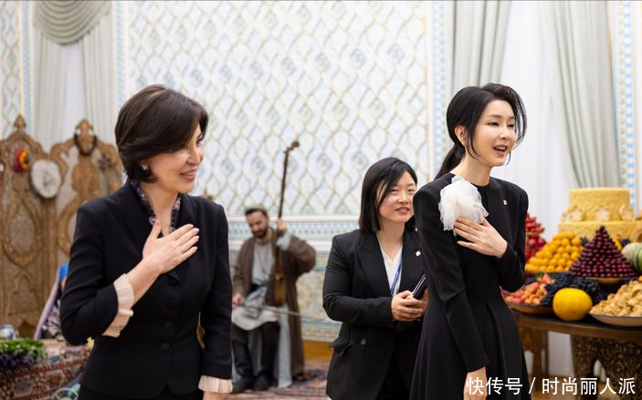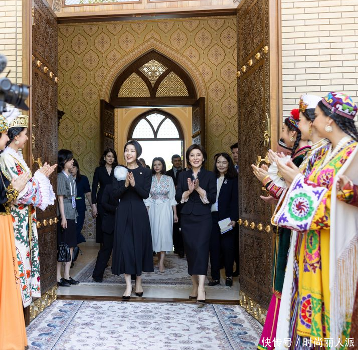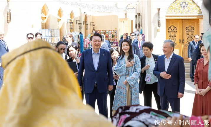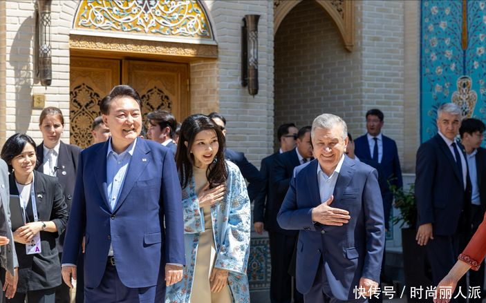 韩国夫人出访最后一天风格大变!穿当地传统印花长袍,披肩发太美