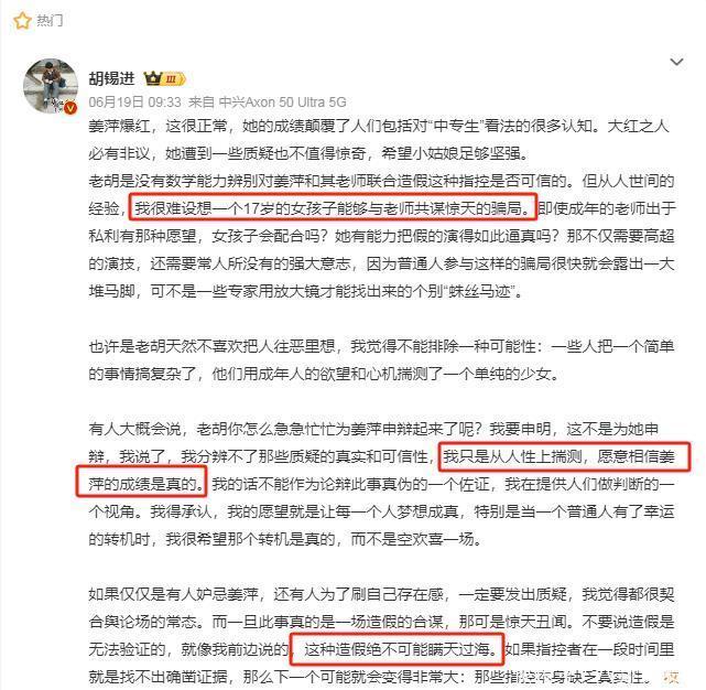 资深媒体人胡锡进公开发文力挺姜萍,不信姜萍与老师共谋惊天骗局
