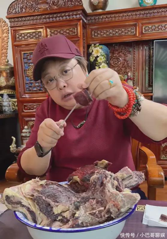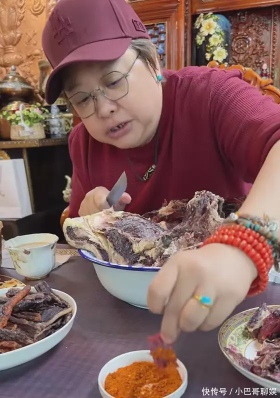 回到家乡,难以忘怀的就是那一口牛羊肉。韩红面前摆着三股市大盘牛羊肉,她竟然用刀扎了直接生吃,蘸辣椒面,大嘴塞到嘴里。韩红非常明显地变瘦了,她依旧素颜朝天,看上去就和普通人一样,一点也没有明星的架子。