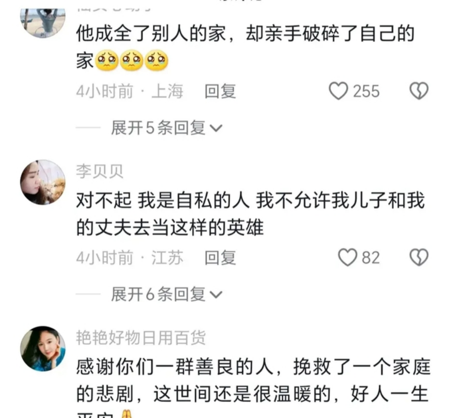 网上的讨论非常激烈。有人赞扬他为别人的家庭带来了希望,却让自己的家庭承受了巨大的损失。感谢那些善良的人,他们的行为温暖了这个世界,愿好人一生平安。同时,也有人提出,不应为他人的过失付出代价,个人安全应放在首位。一时的感动过后,又有谁会真正关心一个破碎的家庭呢?