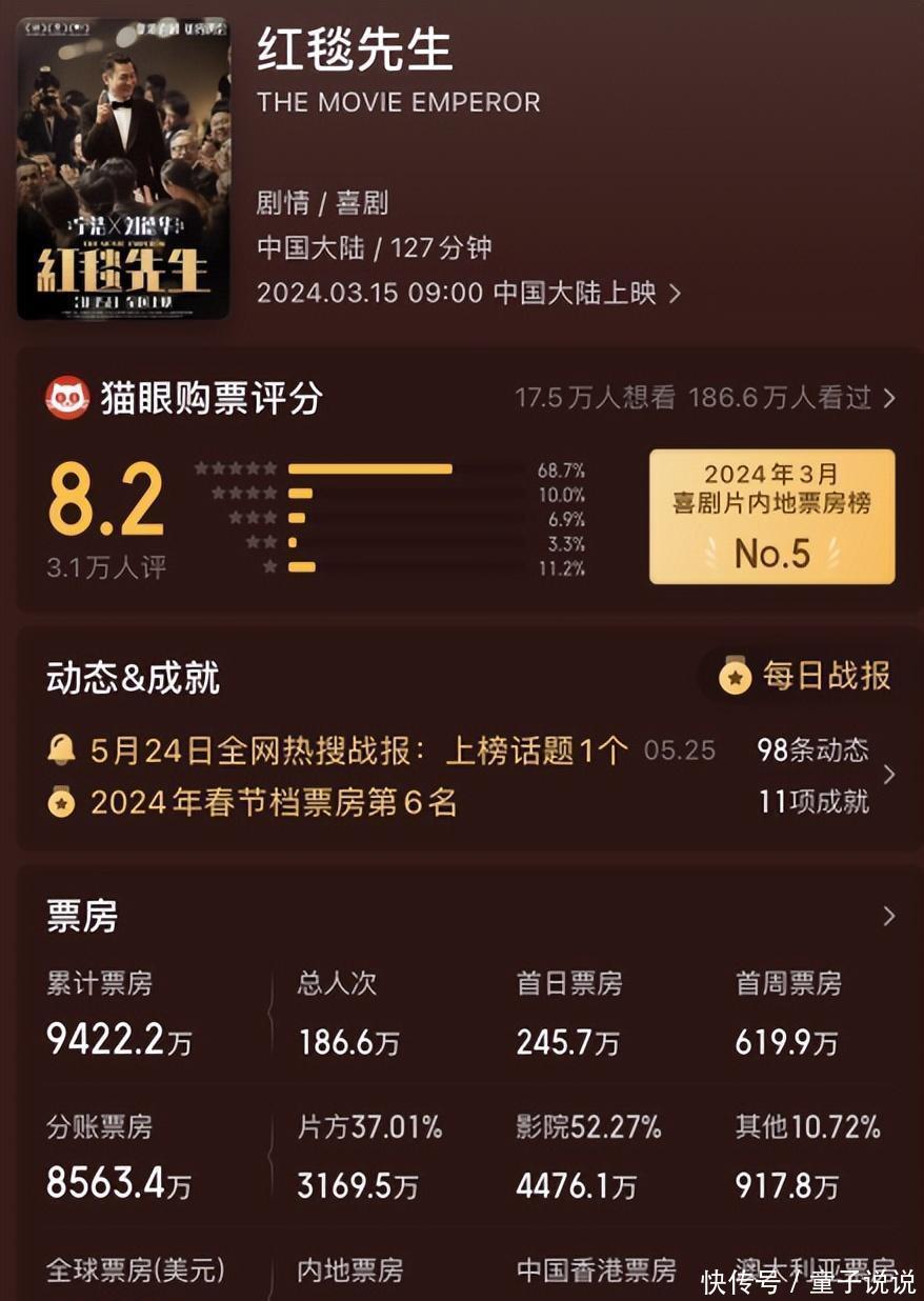 《红毯先生》在春节档本来收割了8400万票房,却还是不敌《第二十条》《热辣滚烫》的热度,排片也上不去,输相尽显。