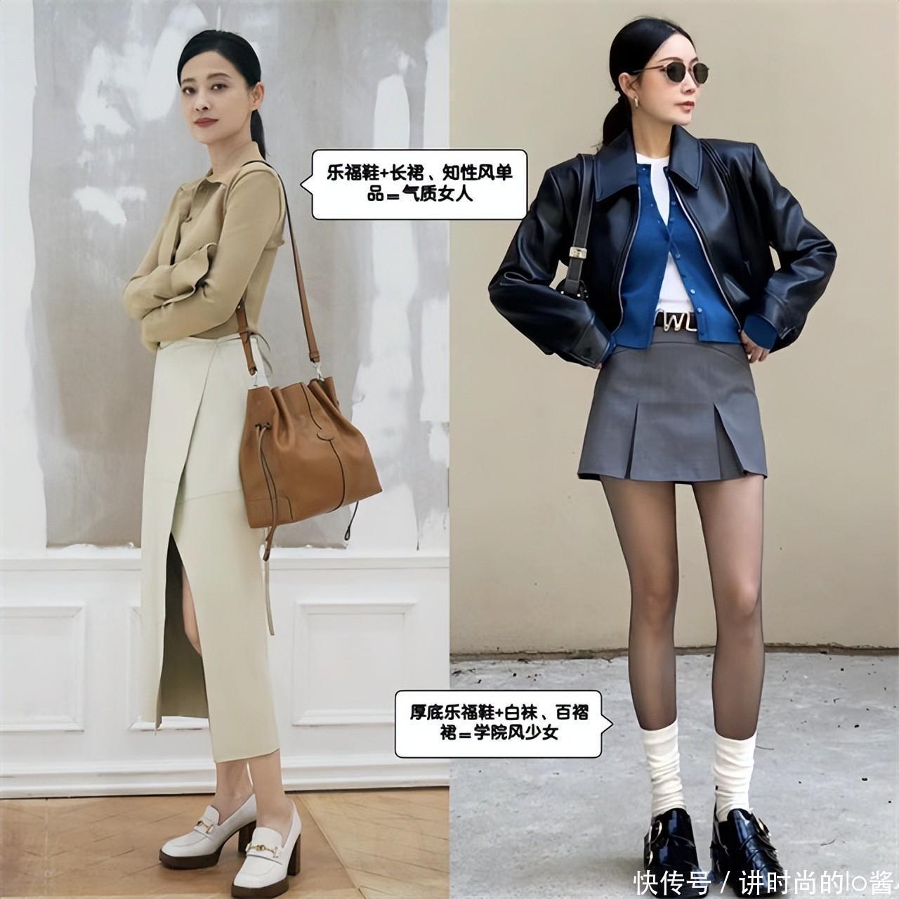 而要想演绎出更加优雅的造型,则建议大家尝试一下带有小低杆设计的乐福鞋和裙子搭配,更能增添女人味。