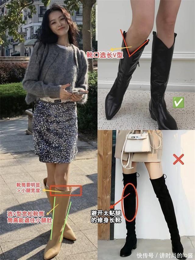 不过大家在挑选长靴的时候,要格外注意如果你所选的长靴属于靴筒整齐的款式,则要多尝试宽松一些的靴筒样式。但若是你属于小腿粗的人群,就可以尝试一下选用了“V字形靴筒”且“靴筒宽松”的长靴搭配裙子。