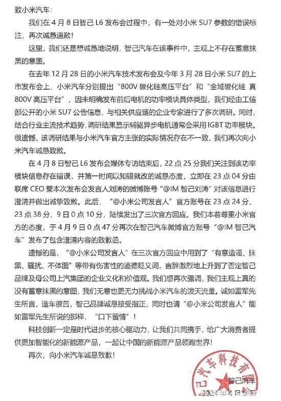 ”。值得注意的是,此前小米发言人连续三次要求智己道歉,其要求