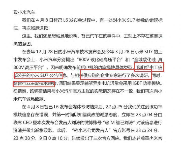 在4月8日的智己的新车发布会上,智己L6能不能火,暂且不知道。不过,智己汽车在小米汽车的三度要求下,最终在4月9日的零点之后,在官方社交媒体上公开澄清并向小米道歉,则是引起了极大的关注,成为汽车圈的“当红话题”。智己智己