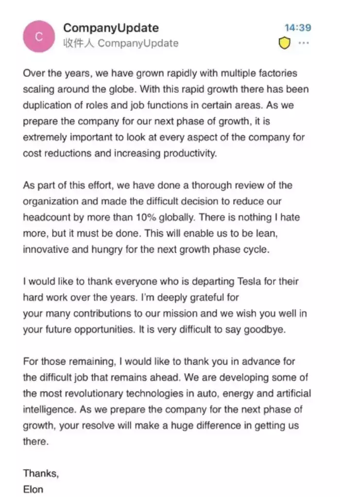 为阻止销量继续下滑,减轻经营压力,马斯克再提降本增效,做出他口中“艰难的决定”——裁减员工超10%。特斯拉全球共有约14万名员工,这就意味着将有超1.4万人被解雇。特斯拉7年第5次也是规模最大的一次“广进计划(裁员广进)”已使员工人人自危,不少人在等待被裁的煎熬中开始另谋出路。