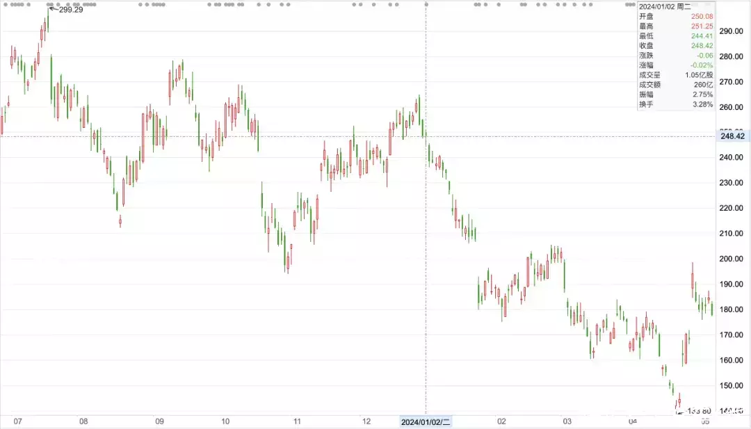 4月2日,特斯拉公布交付数据显示,2024一季度特斯拉全球交付38.68万辆,同比下降9%,环比下降更是超过20%。这是特斯拉近4年来交付量首次出现同比下降,上一次还是2020年二季度因新冠疫情影响,停工停产导致的。而同期特斯拉股价,从新年首个交易日(1月2日)以250.08美元/股“高开低走”,到3月最后一个交易日(3月28日)收于175.79美元/股,季度累计下跌达29.25%,市值蒸发超2300亿美元。