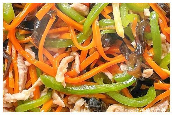瘦肉,胡萝卜丝,黑木耳丝,青椒丝,酱汁。