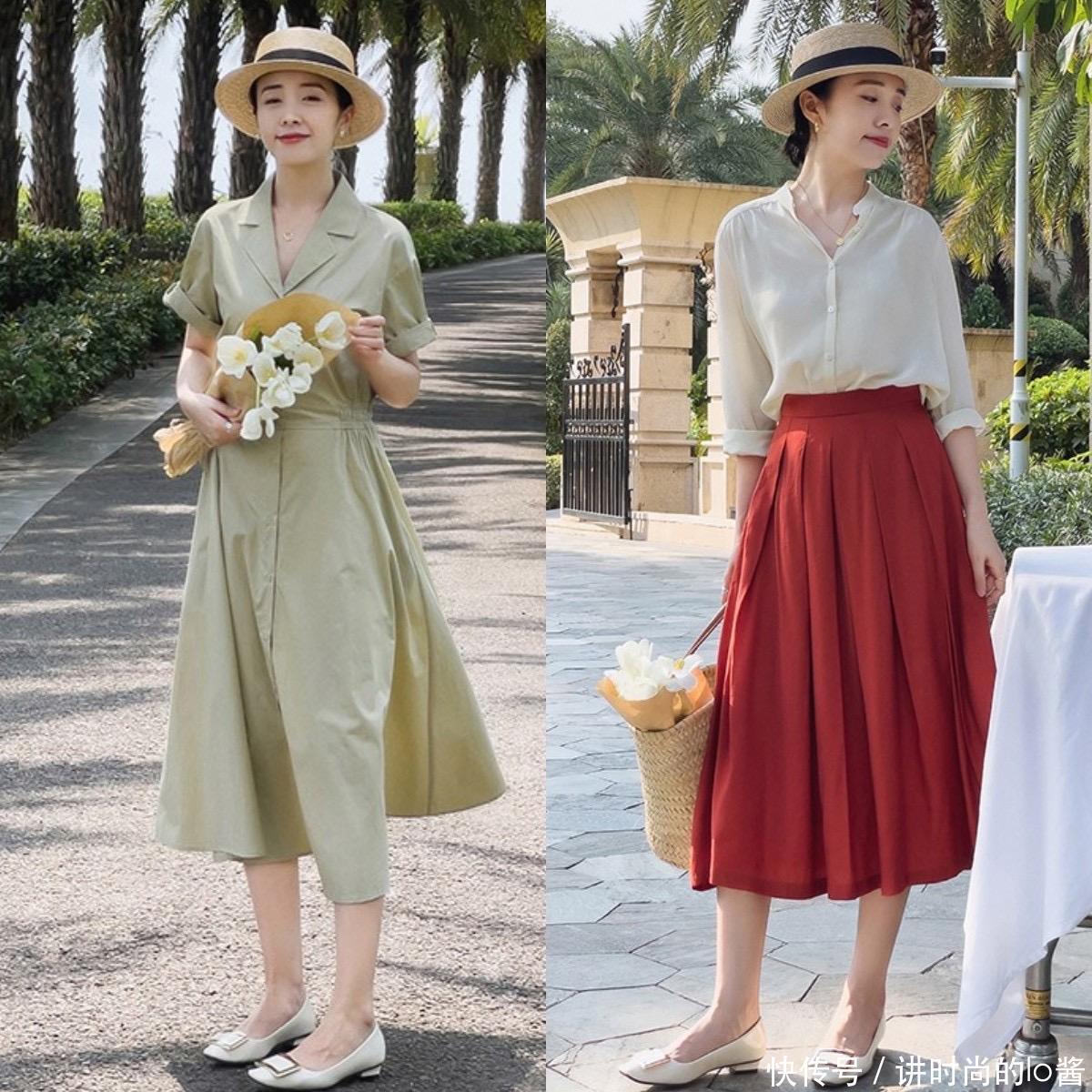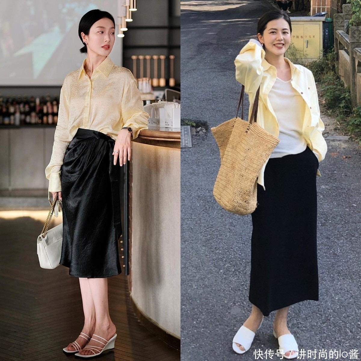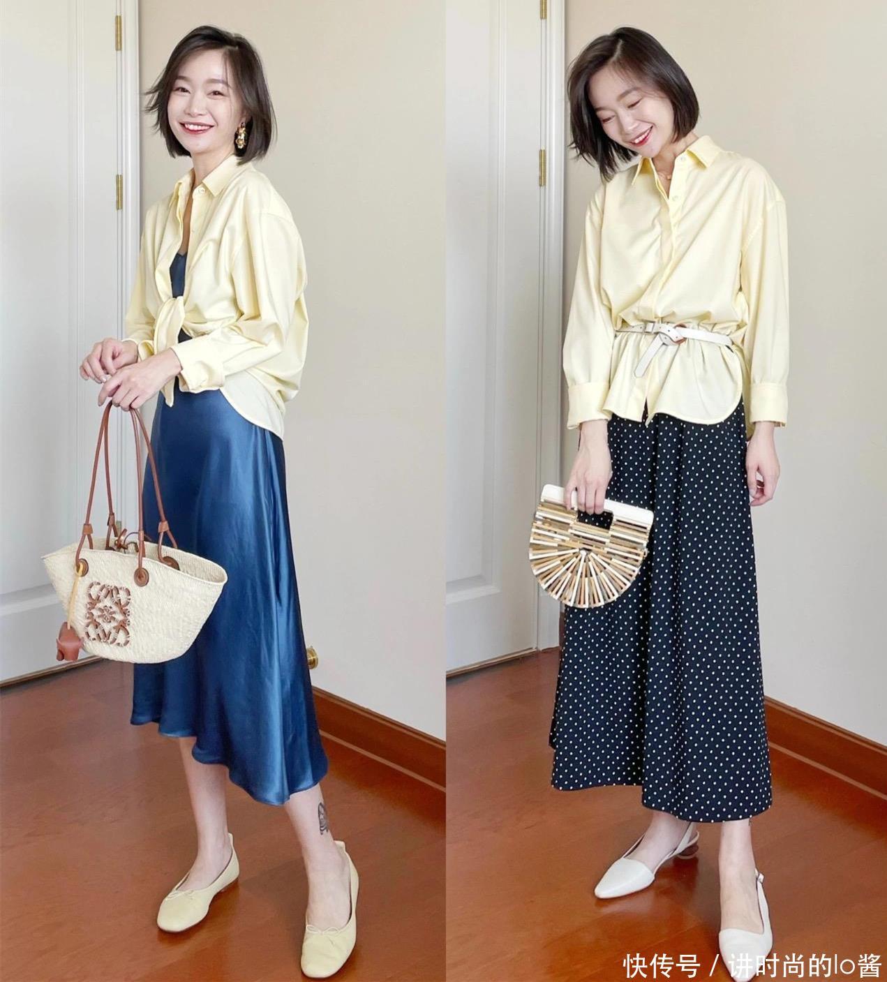 衬衫在春天的出镜率也特别高,在挑选衬衫的时候,可以入手一件色彩比较明亮的款式,搭配过膝长度的半身长裙,露出纤细的脚踝线条,再采用“塞腰”的方式掐出腰线,无论是小个子还是五五分的身材,都是不在话下的。