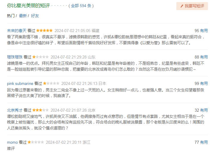 最后再吐槽一下,谭松韵和许凯真的一点儿都不扛剧,《你比星光美丽》上线一天口碑就崩了,首页随机显示的五条热评,有3个一星、一个三星,除了上面吐槽的点外,还有不少观众吐槽和原著差距太大。