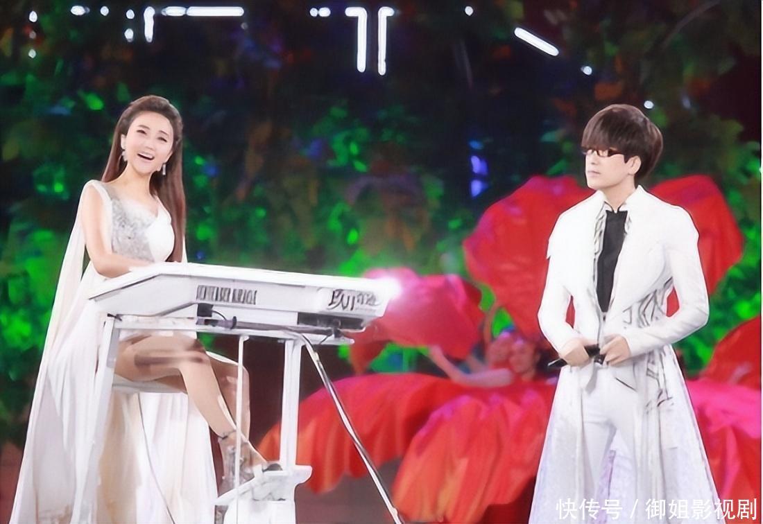 舞台上的他站立着拿着话筒,旁边是坐在一台双排键钢琴前面的王小玮。