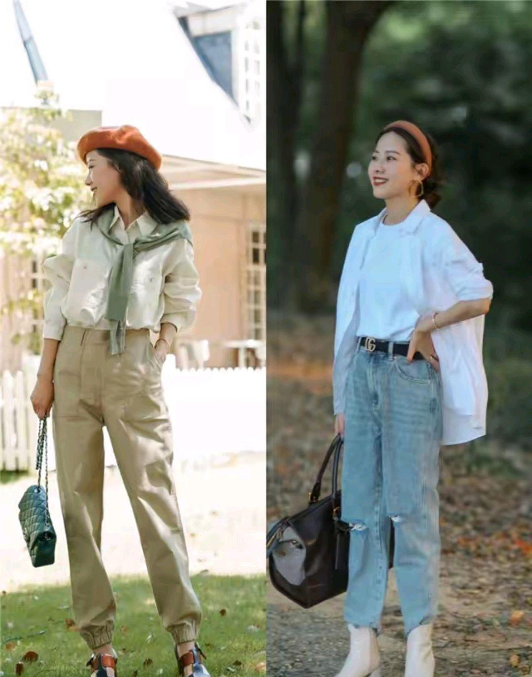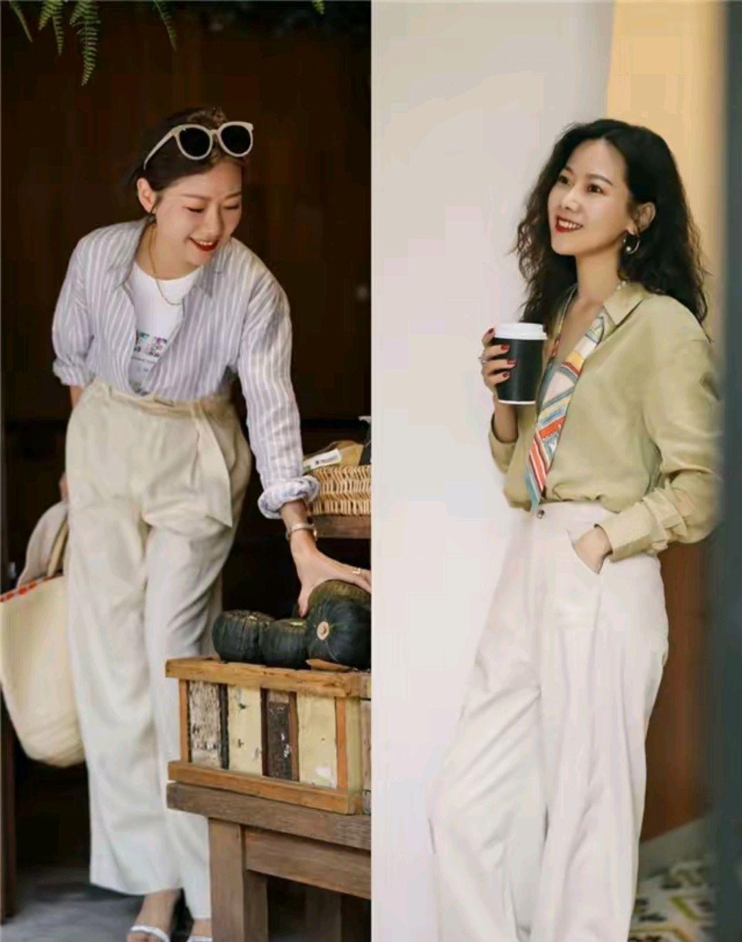 ④、设计感突出的衬衫搭配长裤会让你更时尚洋气