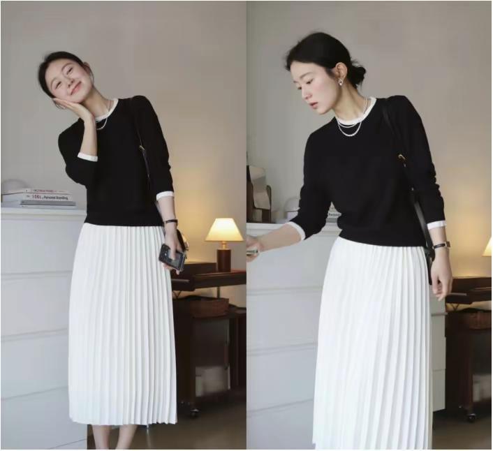 如果是新手小白的情况下,不太会配色,为了降低出错率,可以向下面这位达人选择黑色的针织上衣,搭配上白色的半身裙,黑白两个颜色组合非常的经典耐看,而且不挑人,更不挑年龄。