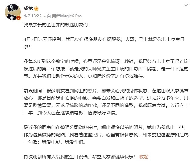 成龙70岁生日发文,自曝断崖式衰老真相,但更糟糕的事情正在发生